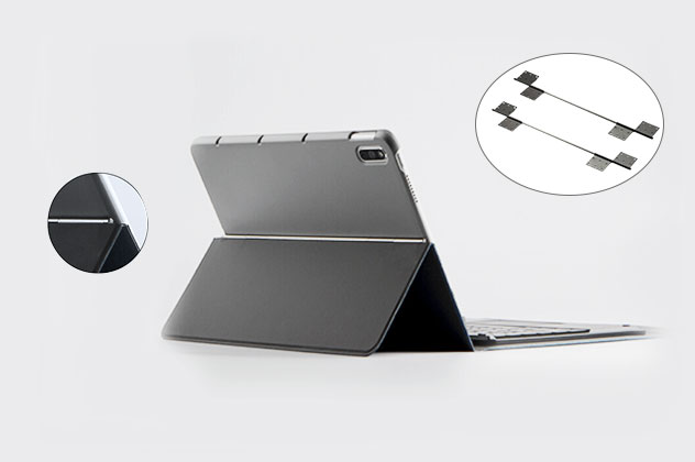 皮套转轴,又称为合页转轴,是一种关键的结构部件,安装在皮套内部,用于折叠处,能够实现平板电脑的折叠和旋转开合功能。它的作用是保持设备在固定和旋转时的稳定性。皮套转轴可以使平板电脑在不同角度下保持固定,不会垂落,满足不同场景下的观看需求,提供更好的可视性和操作体验。此外,在转动过程中会有一定的阻尼感,手感非常舒适。带有内置阻尼转轴的折叠支架型平板电脑皮套备受消费者喜爱。